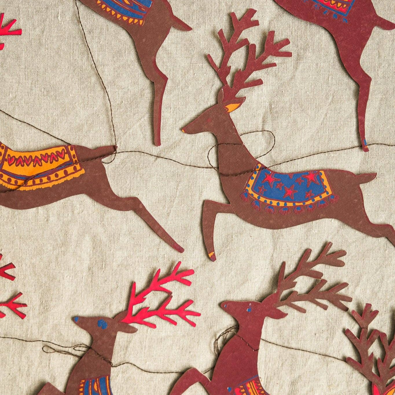 Bring a touch of festive charm to your home with this delightful Reindeers Sewn Garland from East End Press. Adorned with ten graceful reindeer, this enchanting garland stretches three meters long, making it perfect for draping over mantels, doorways, or festive tables. Each reindeer is meticulously screen printed by hand, showcasing unique designs on both sides, and sewn together with strong cotton thread for durability.