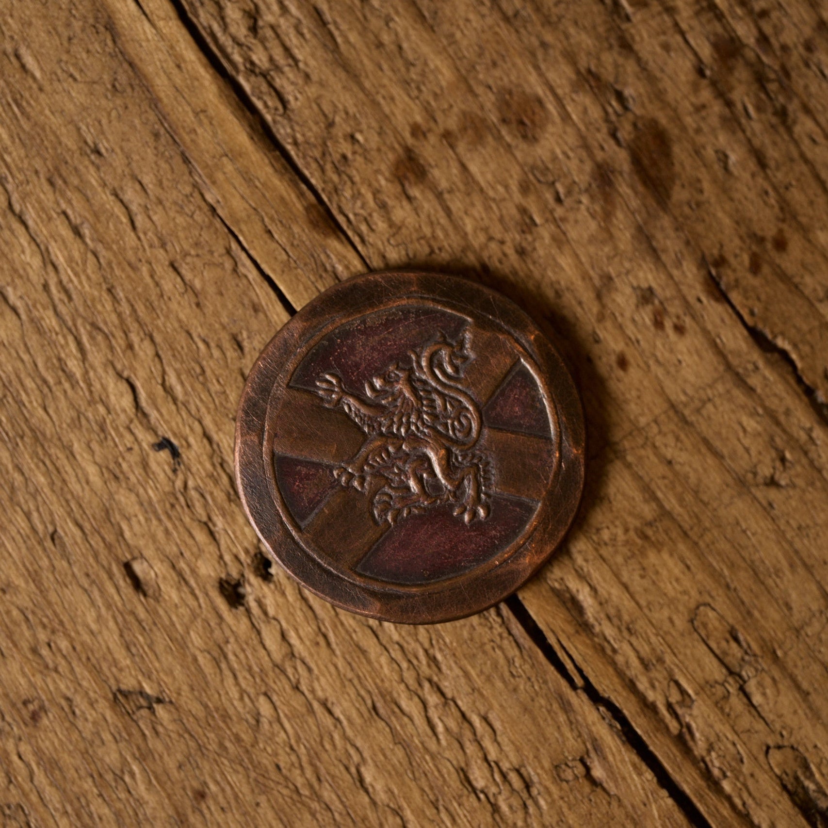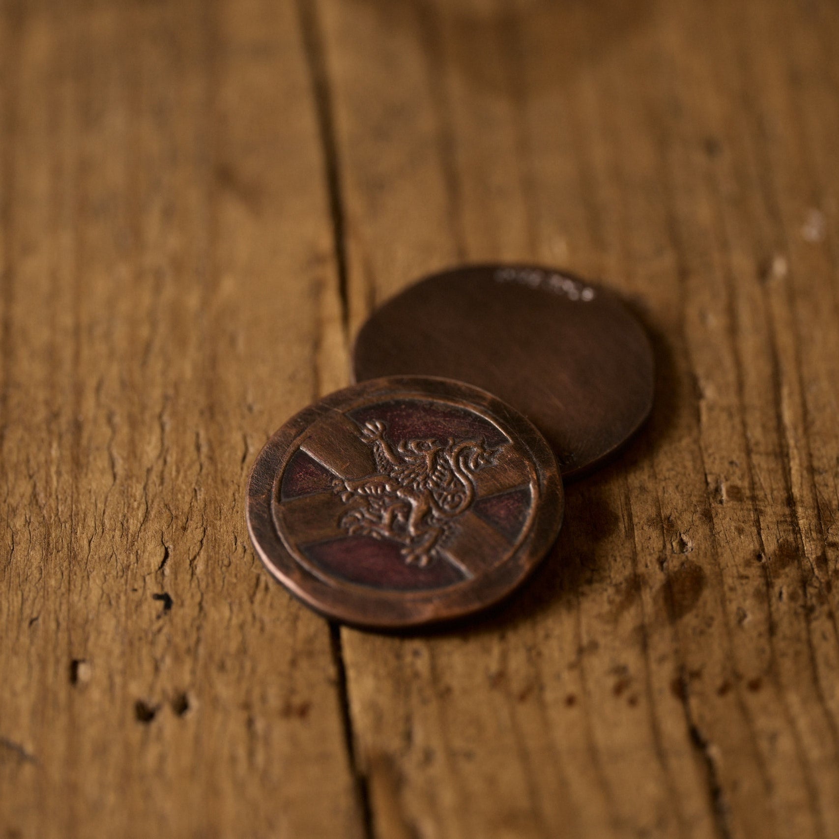 Hand-forged in Scotland by a master swordsmith, this copper ball marker carries the detail and weight of true craftsmanship. Each piece is shaped and struck by hand using the same techniques once used for blades, giving it a tactile finish that develops a natural patina over time. The front is engraved with the Lion Rampant and the Saltire, two symbols of Scottish pride, while the reverse reads ‘Made in Scotland’ alongside the Fyfe Golf emblem. There is an option to have your initials stamped into the copper, adding a personal mark to a piece already rich in character. Measuring roughly four centimetres across, it feels substantial in the hand without being intrusive in the pocket.