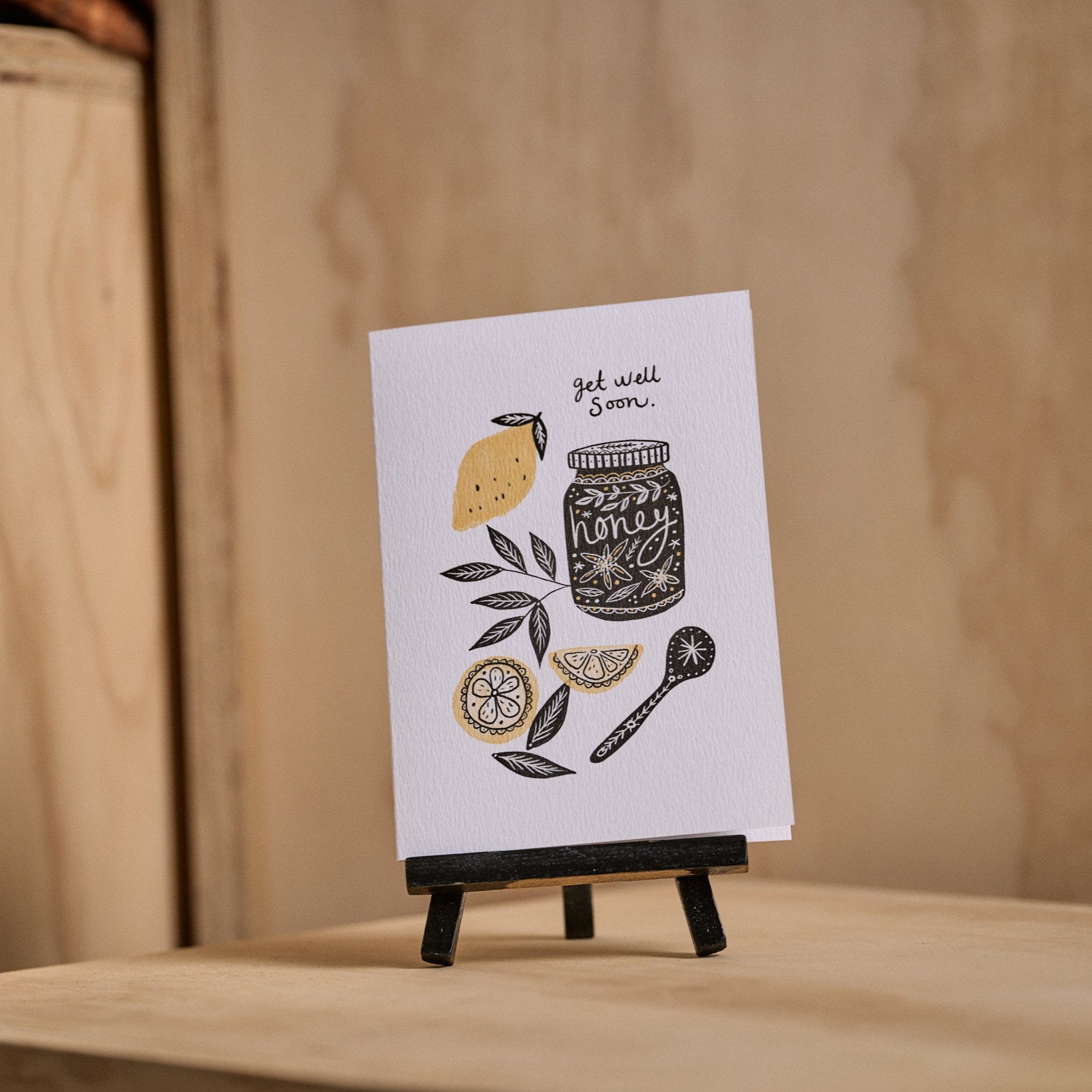 Send a little comfort and care with this beautifully illustrated Get Well Soon card by Juniper Press. Featuring a folk-inspired drawing of honey, lemon, and a spoon—classic symbols of soothing and healing—this design is full of gentle charm.