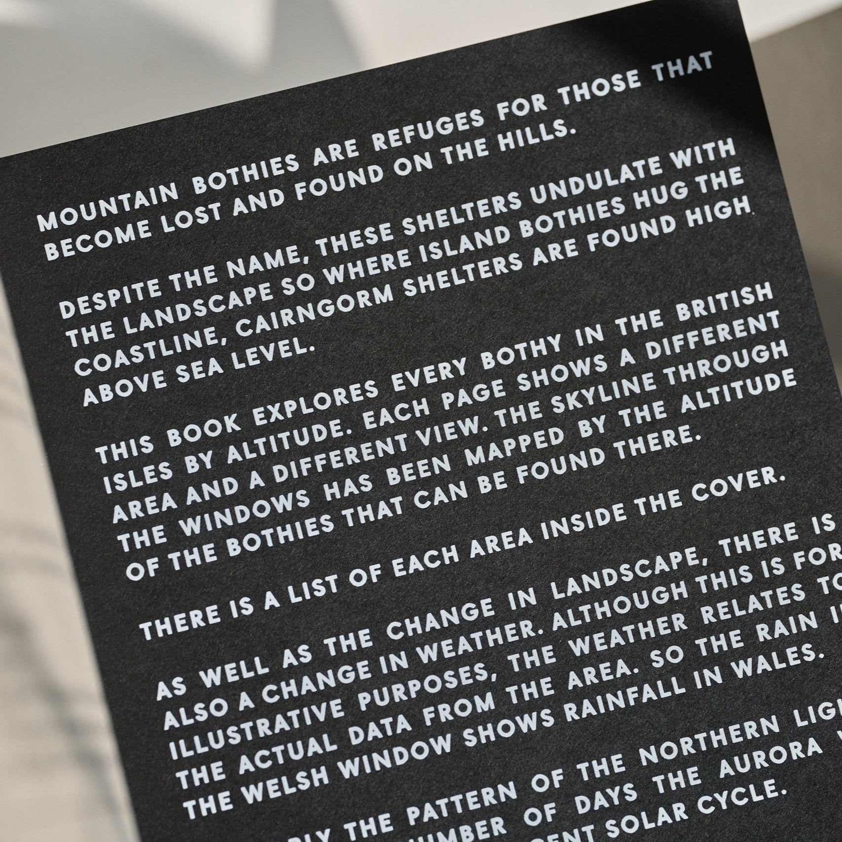 More than just a book, it weaves in atmospheric details—rain based on real rainfall data, and northern lights in Shetland, inspired by aurora activity. With an inside cover explaining the view from each bothy window, the book even folds out into your very own bothy, making it a piece to experience as well as read.